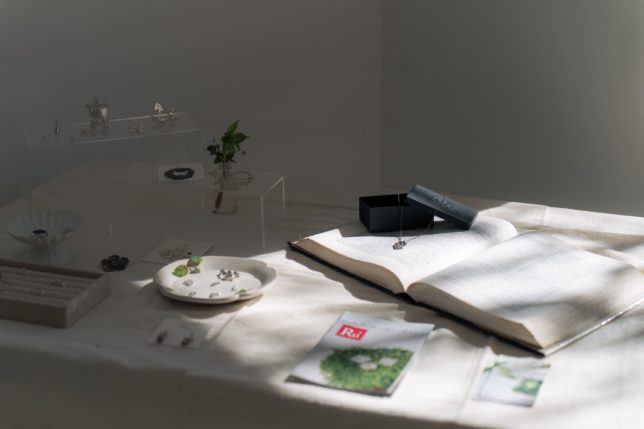 光を浴びる古本の上に置かれた繊細なネックレス。ガラスの小瓶の緑と、鈍く光るシルバーの小片。静謐で美しい光が満ちていました。