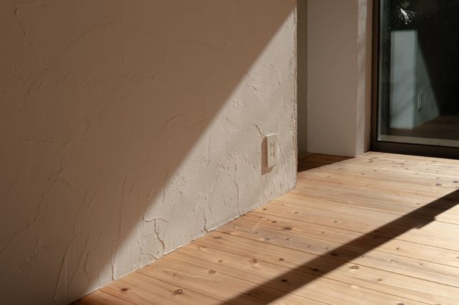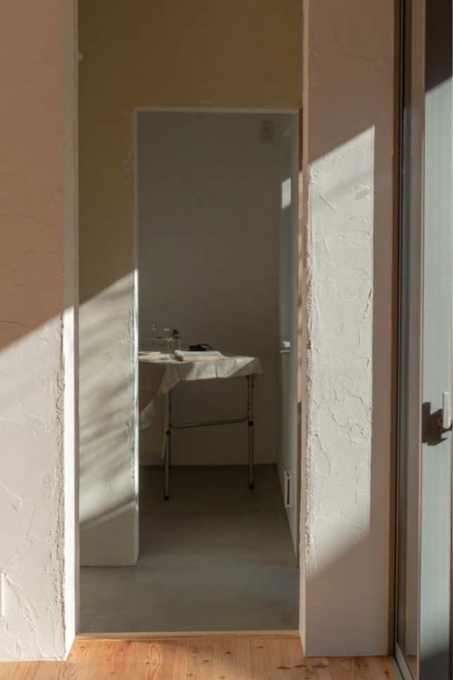 空間の主役となるのは、光と素材そのものです。手仕事の痕跡が残る漆喰の壁に、時刻と共に表情を変えながら落ちる鋭い光と影。無垢の床板に描かれる、暖かな日溜まり。