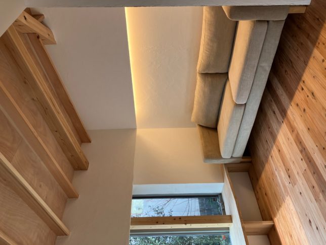 アトリエでの賑やかな交流の時間から一転し、そこには「家族のための静かな時間」が流れていました。自然光を浴びる木目の天井と白い塗り壁。ソファに腰を下ろし、間接照明の柔らかな陰影に包まれるひととき。確かな骨格を持った器が、これから始まるご家族の穏やかな日常を静かに待っているような、確かな安らぎを感じる光景でした。