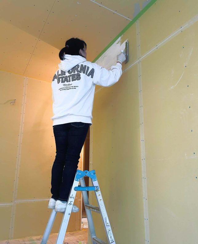 足元には、柔らかく温もりのある杉の無垢材を敷き詰めています。そして、空間に柔らかな質感を添えている一部の漆喰壁は、なんと**お施主様ご自身による施工(DIY)**で仕上げられました。