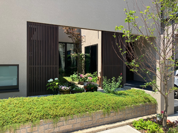 外観はアースカラーの壁面と木製竪格子、植栽で構成。