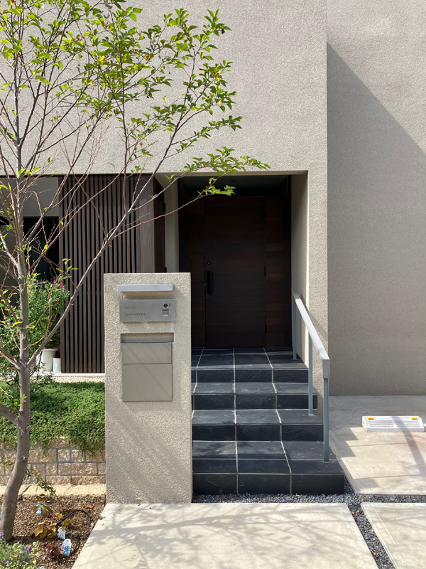門柱は表札、ポスト、インターホンを美しくレイアウトしました。