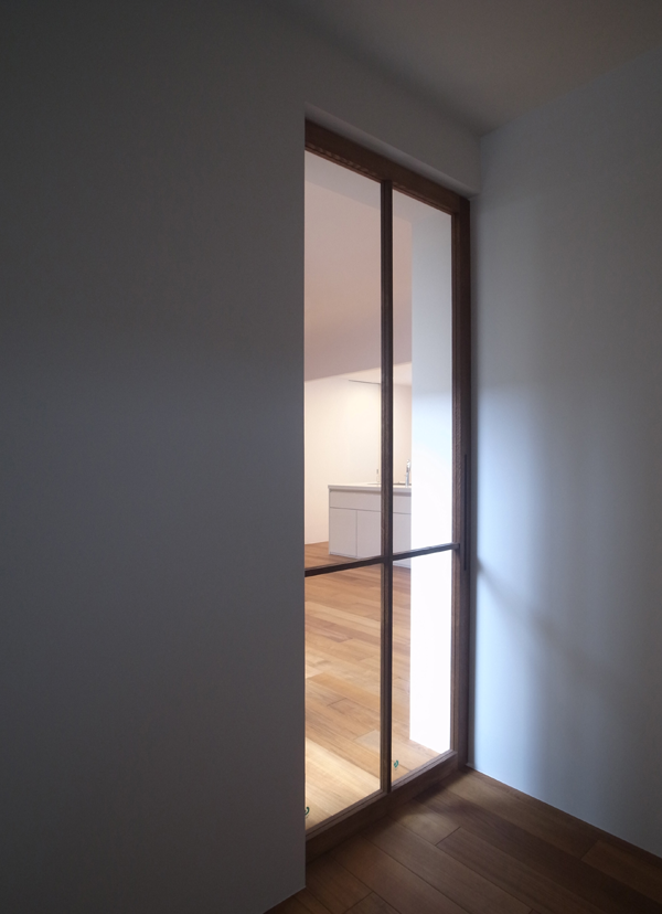 玄関ホールからリビングへのガラス框の建具。