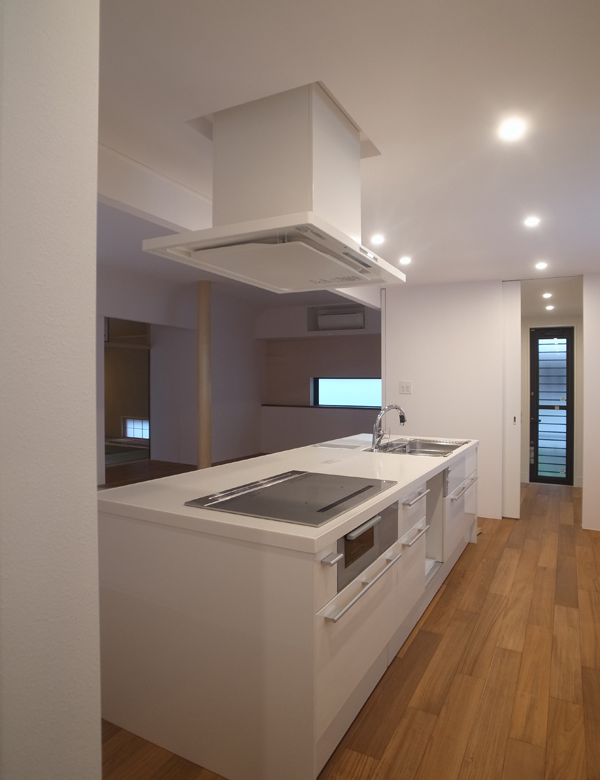 アイランドキッチンやウォールキャビネット面材も白で統一してスッキリとした印象に。