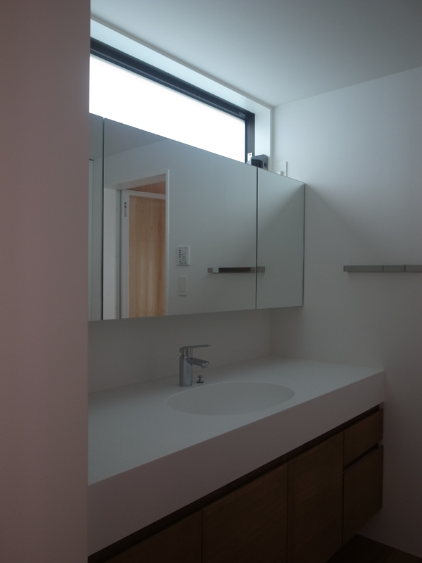 コーリアン(人工大理石)製の一体成型した洗面カウンターとミラーキャビネット。