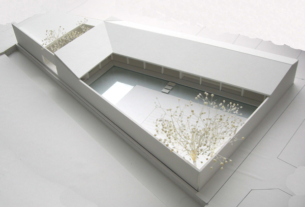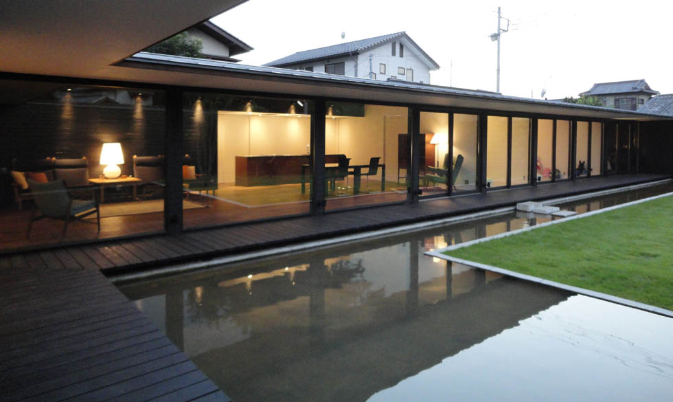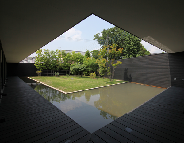 庇をめぐらせて日射制御を施すと共に、地下水を利用した水盤から涼を得ています。