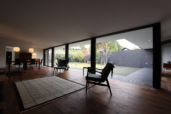 壁に外壁と同じカラマツ材を使用することで緩やかに室内外をつなげ、空間に連続性を持たせました。