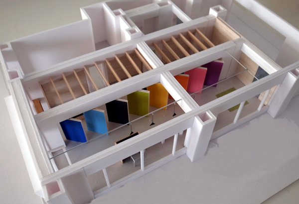 表側をカラフルなグラフィック面(メラミン化粧板)、裏側をナチュラルな表情の木の面(桧のチップを固めた国産OSB)で構成された回転扉は、360度回転することができ、自由に角度を調整することで、空間のつながりを変化させることができます