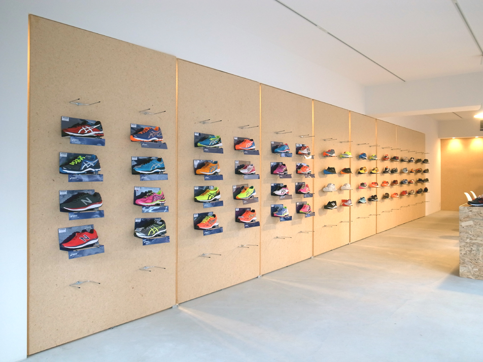 回転扉はパーティションとしての機能を持ちながらも、商品を展示できる「ディスプレイWALL」としての役割も担っており、メインアイテムであるランニングシューズの豊富さを見せながら、色のバリエーションや絵柄をメーカーごとに整理して展示することができます